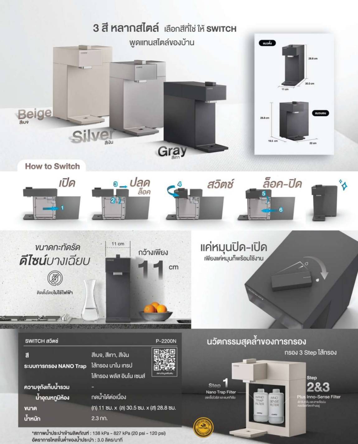 เครื่องกรองน้ำรุ่น สวิตช์ P-2200N สวิตช์ได้ ทุกความต้องการ ขนาดกระทัดรัด ดีไซร์บางเฉียบ กว้างเพียง11ซม.ประหยัดพื้นที่ใช้สอย ติดตั้งได้โดยไม่ใช้ไฟฟ้าค่าไฟ0บาท เพียงแค่หมุนมือจับ ก็พร้อมใช้งาน ราคาเริ่มต้นเพียง299บาท/เดือน